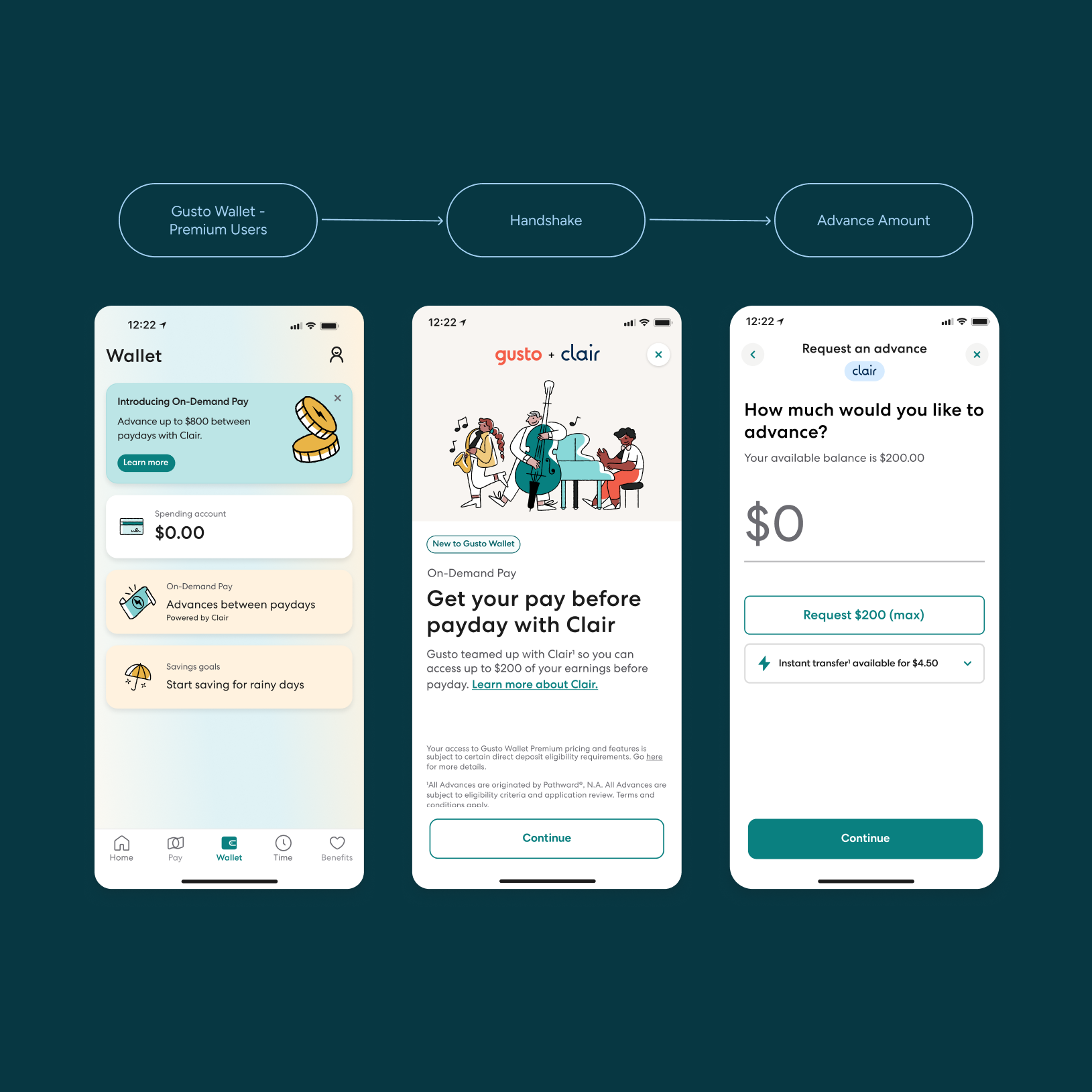 Gusto integrated Clair’s embedded On-Demand Pay solution, driving 74% conversion, with 50% of users receiving their first advance within 90 seconds or less.1